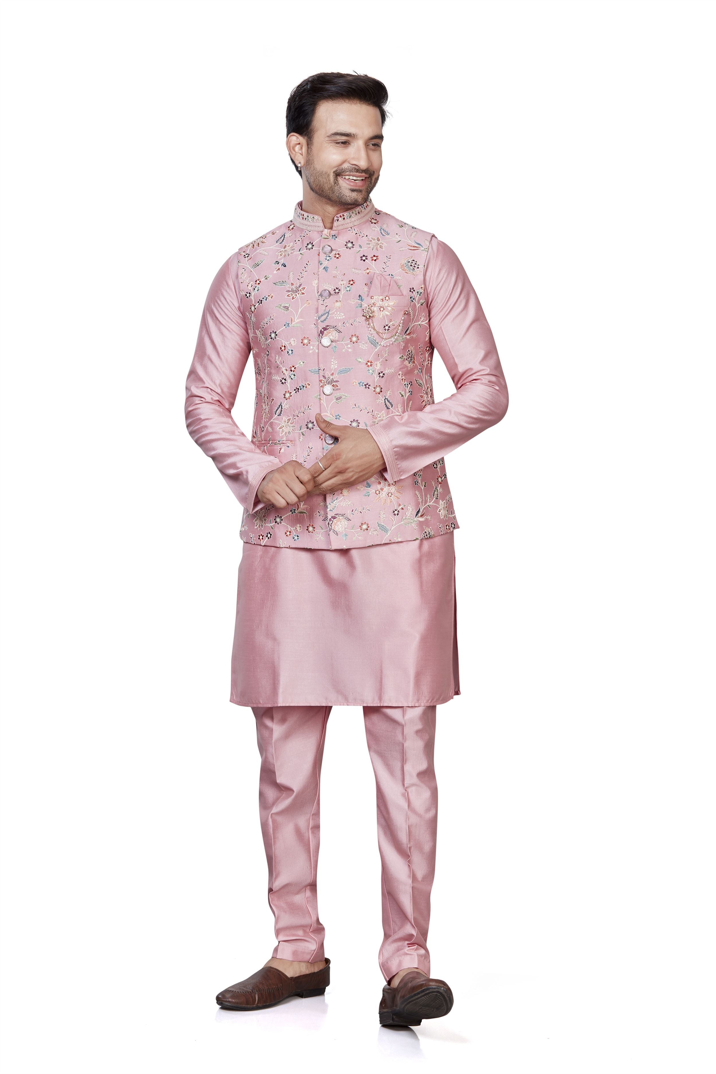 The entire set is in a soft, pastel pink shade, the kurta is plain with a slightly glossy silk, The standout piece is the sleeveless Nehru jacket, intricately embroidered with a floral pattern in multiple pastel colors. It's paired with same color pant style bottom.