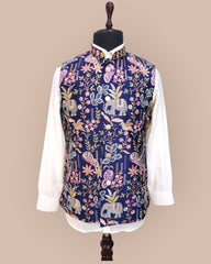Step into timeless elegance with this Royal Blue Embroidered Nehru Jacket, a perfect blend of tradition and artistry. Set on a rich wine-colored base, this ethnic masterpiece features intricately embroidered motifs of elephants, birds, florals, and foliage, offering a royal yet whimsical vibe. The detailed embroidery in soft pastels and gold tones gives the piece a luxurious feel, ideal for festive and formal occasions.